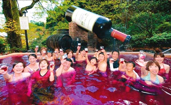 紅酒浴,紅酒有助于美容養顏、養氣活血,緩解皮膚松弛,紅酒對輕微貧血的女性有好處,促進胃腸消化能力。躺在浴池中,有木有微醺的感覺呢。