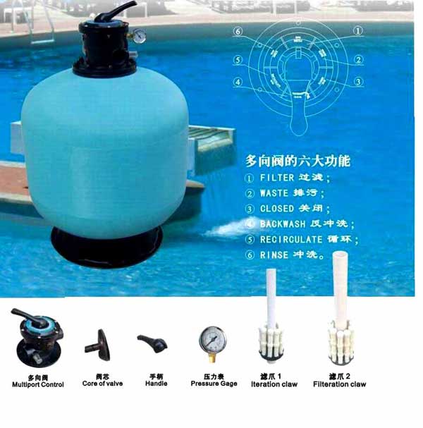 作用:過濾泳池水,使?jié)岫冉档汀Mㄟ^循環(huán)水泵抽水加壓將泳池(含按摩池,下同)水不斷輸送到過濾器使污物截留在過濾器的濾料(通常是采用特制粒徑的石英沙)面層,而干凈的水則穿過濾料得到凈化。