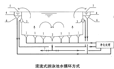 混合流式循環即泳池內60%-70%的循環水量經池壁外側的溢水回水槽取回,另外30%-40%的水量,經設在池底的回水口取出,將這兩部分循環水量合并進行凈化(加藥、過濾、加熱及消毒)后再送回池內繼續使用的水流方式。